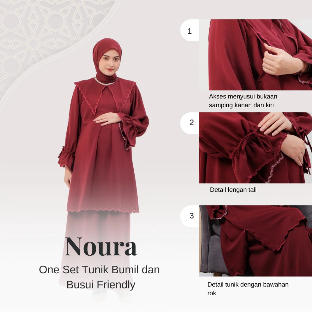Momiasi hadir untuk melengkapi moment spesial mommies dengan product One Set Tunik Melayu Noura. Noura dibuat dengan bentuk longgar yang memberikan keleluasaan dan kenyamanan bagi ibu hamil dan menyusui agar dapat tetap bergerak dengan nyaman. Detail bordiran pada lengan dan baju menambah kesan elegan pada tunik ini, membuat product ini cocok untuk digunakan mommies pada moment besar dan hari raya idul fitri nanti.