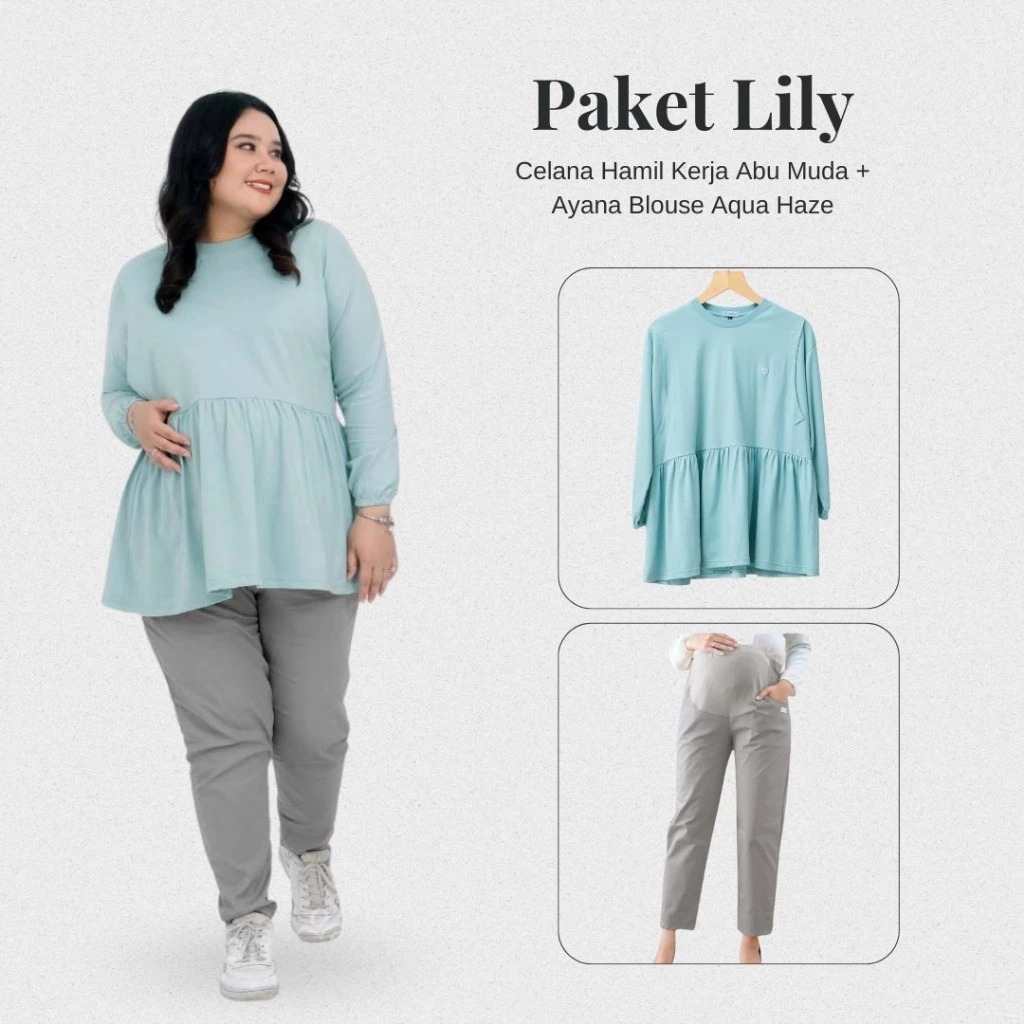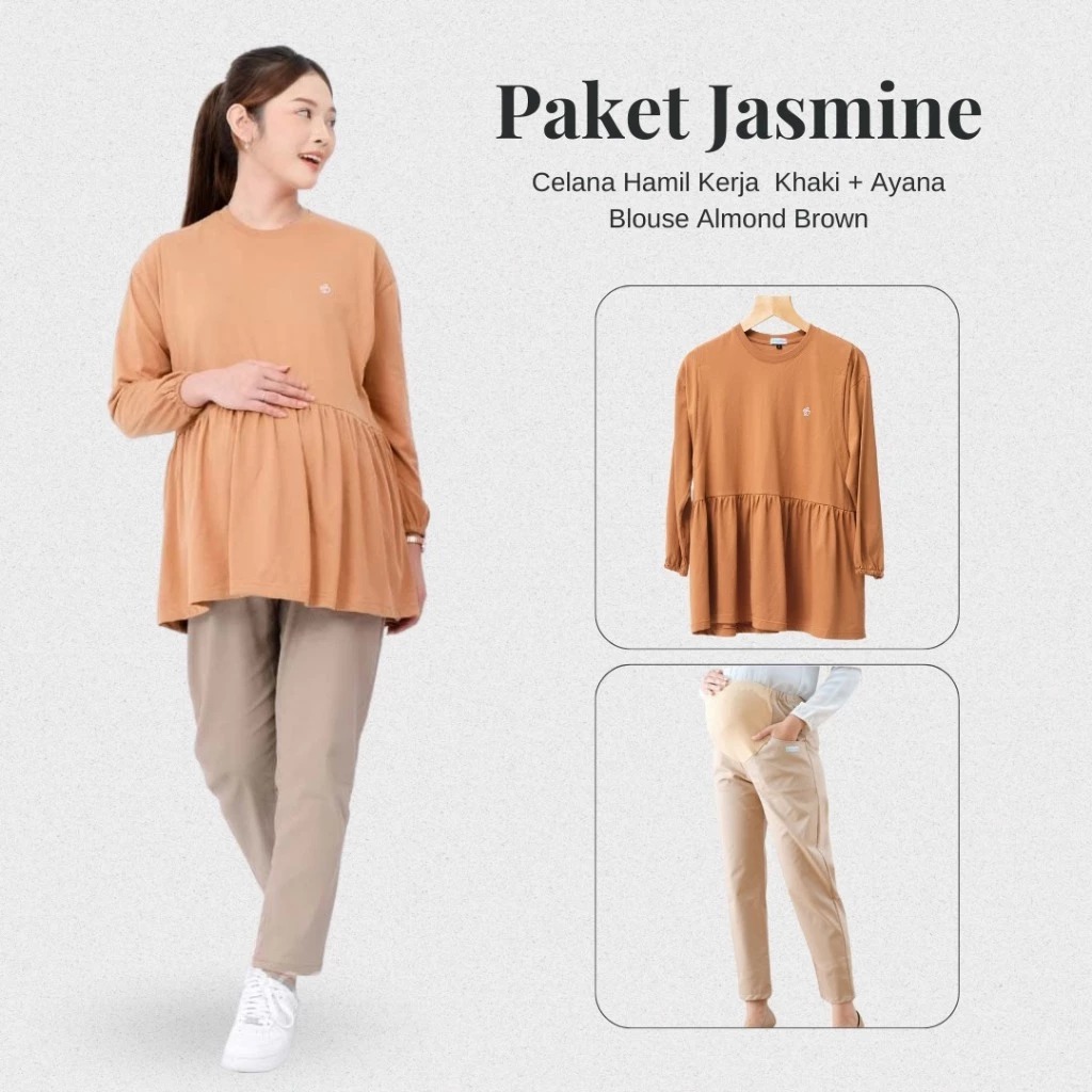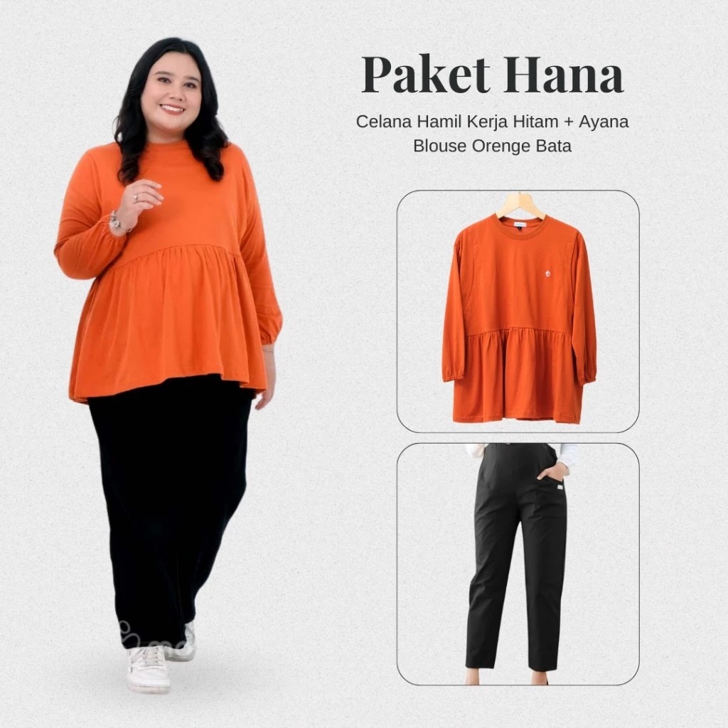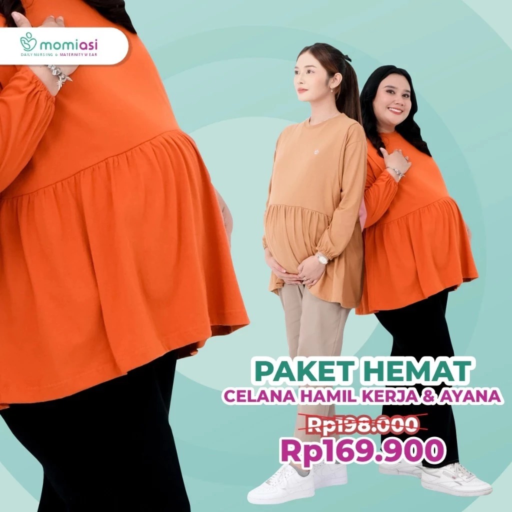 Paket hemat untuk Momi nih ! Checkout 2 produk sekaligus dapetin harga nya lebih murah 😊 Dan Momi gak usah bingung lagi nge mix and match produk karena sudah sepasang celana hamil kerja dan baju ayana blouse busui di jamin makin stylish dan fasionable !